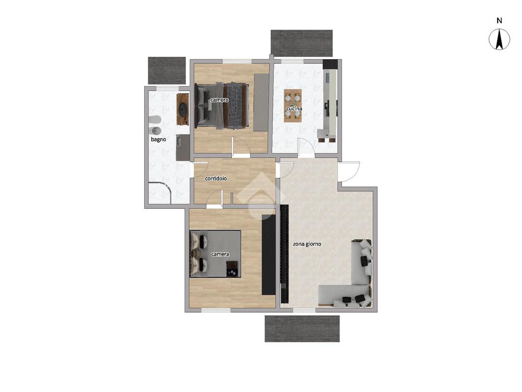 La zona notte, ben distribuita, offre due camere da letto di generose dimensioni, pensate per garantire comfort e privacy.