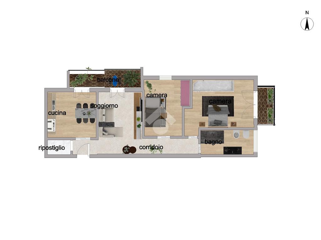 La zona notte ospita due camere da letto, entrambe di generose dimensioni e rifinite con pavimento in legno; la camera matrimoniale è arricchita da un secondo balcone.